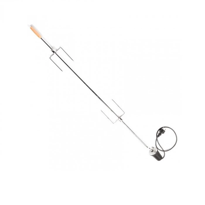 Il comprend une broche en acier chromé avec manche en bois et fourchettes et un moteur électrique à brancher sur 220 volts.